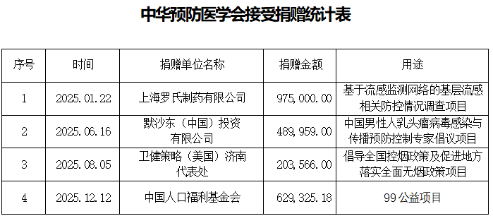 根据《中华人民共和国公益事业捐赠法》《卫生计生单位接受公益事业捐赠管理办法(试行)》相关规定,受赠人应公开捐赠情况,接受社会监督。2025年1月1日至2025年12月31日,中华预防医学会共接受捐赠2,297,850.18元,如下表: