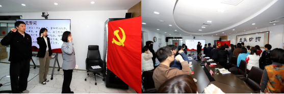 活动第一项内容是预备党员宣誓仪式。《国际歌》奏毕,党办冯岚同志宣读了关于接收董超、邴丛萱两位同志转为中共预备党员有关情况的介绍。在刘霞书记领誓下,两位预备党员面向党旗庄严宣誓,其他党员共同重温入党誓词。董超和邴丛萱两位同志分别作表态发言,学会专职副会长兼秘书长、理事会党委书记杨峰同志代表老党员发言,寄语和勉励两位预备党员以实际行动践行共产党人的初心使命。仪式最后,全体党员职工齐唱国歌。