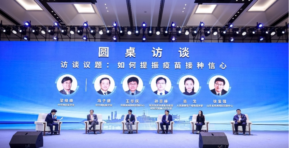 大会专门设立了圆桌访谈,由中华预防医学会副会长梁晓峰主持,邀请中华预防医学会副会长冯子健、中国疾病预防控制中心免疫规划首席专家王华庆、新突发传染病新型疫苗研发全国重点实验室主任孙京林、人民日报健康客户端新媒体部主任吴戈、山东省疾病预防控制中心首席专家徐爱强5位专家,围绕疫苗犹豫影响因素分析及克服疫苗犹豫、提振接种信心的有效路径进行了访谈交流。